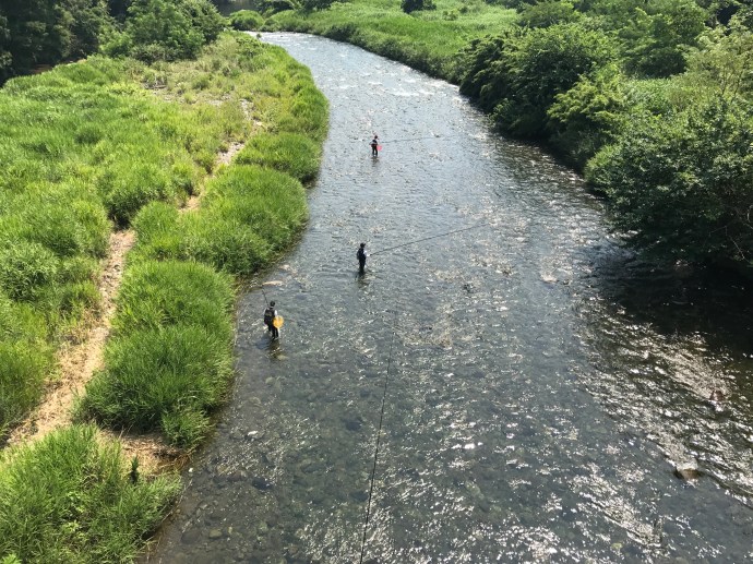 角田大橋からは、釣りを楽しむ人々の姿が多くみられます。下って行くと、右岸には、川遊びを楽しむ人々の姿が見られ、その景観は、さながら避暑地のようです。