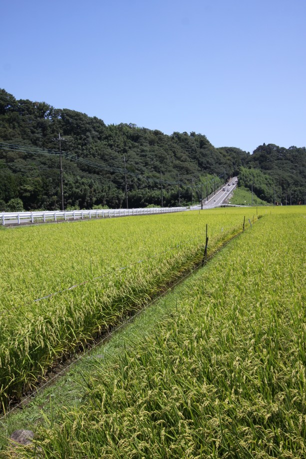 中津方面から向かう際は、県道の中津交差点を水道みちの方に進み、水道坂を下っていきます。急坂の途中から見え出す田園風景は絶景で、あいかわ景勝10選にも選ばれています。