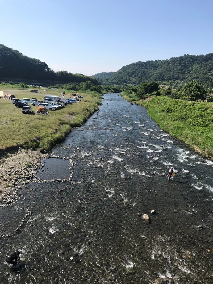 鮎釣りが解禁されると、八菅橋付近にも多くの釣り人が訪れ、賑やかな風景が広がります。