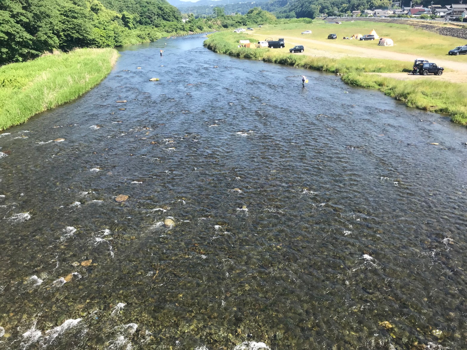 鮎釣りが解禁されると、八菅橋付近にも多くの釣り人が訪れ、賑やかな風景が広がります。