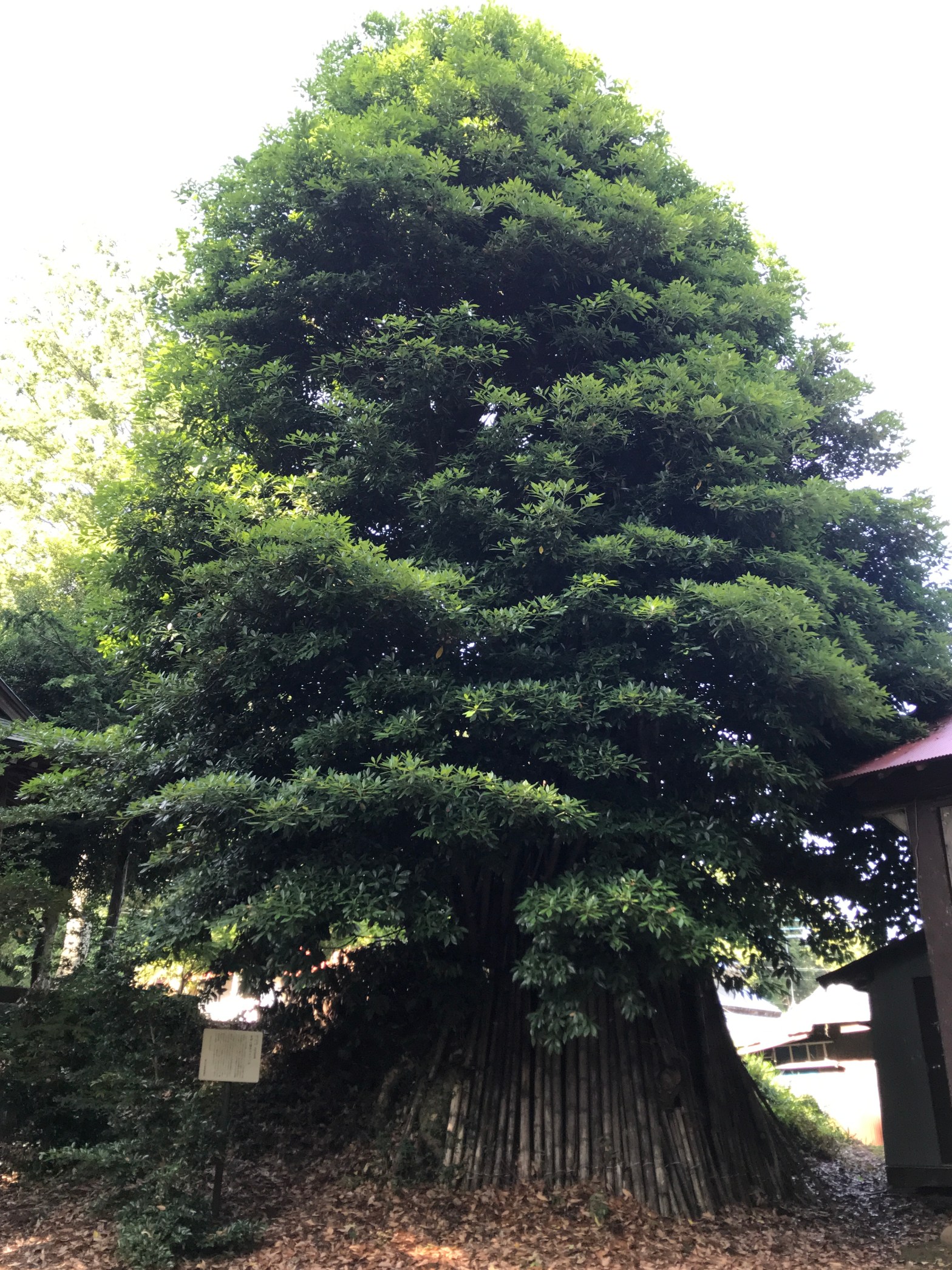 境内にそびえ立つ巨木「タブノキ」は、町の指定天然記念物。過去の強風で、一部分が折れてしまいました。復旧工事がなされ、鮮やかな葉を生い茂らせています。
