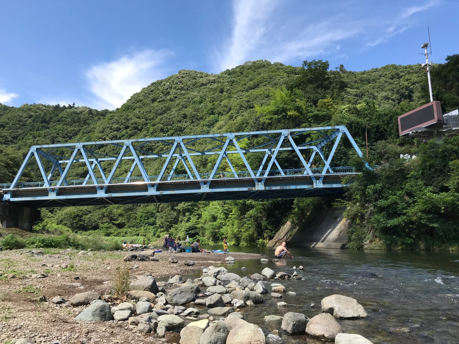 県道54号(相模原愛川線)と隠川を結ぶ愛川橋は、昭和49年(1974)に架けられました。青い色が目印のトラス橋は、川面に映る影も良い雰囲気です。