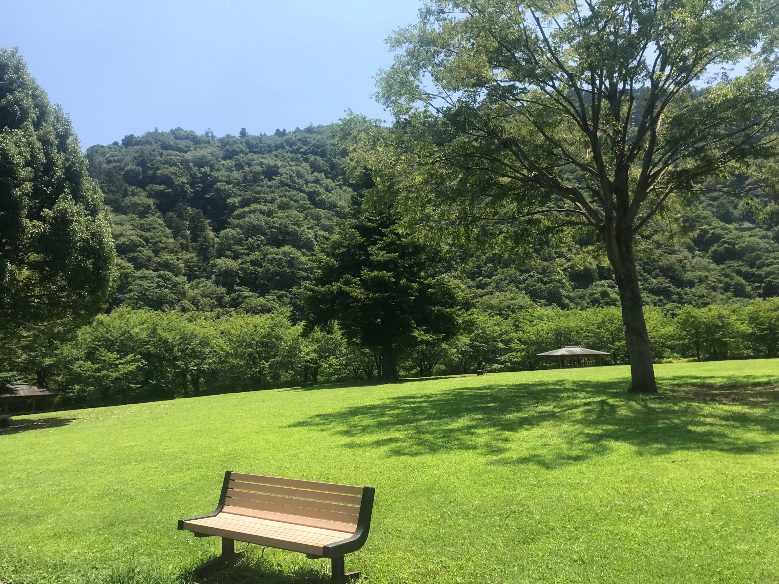 ふれあい広場。木陰やベンチや四阿でピクニックを楽しんだり、芝生の上で遊んだり。