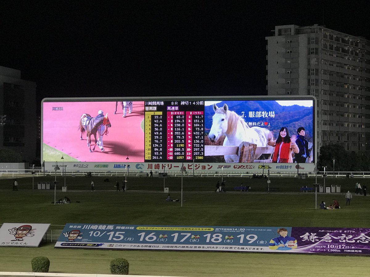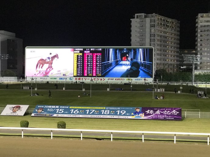 10月15日(月)、川崎競馬場の2904型のドリームビジョンで、再び「だいすき。」を放映した。下の写真のどこかに豆粒大のオダ監督が映っている。