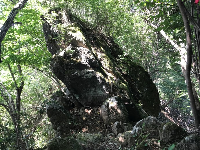 頂上西側の少し下がったところに巨岩、経石(きょうせき)があり、真ん中に石が食い込み蓋のようになっています。